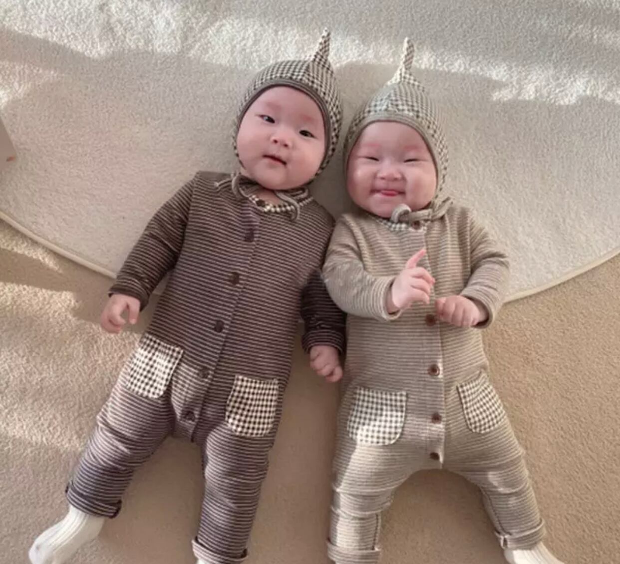 新生児〜100cm ボンネット 帽子つき シンプル 長袖ロンパース ボーダー チェック