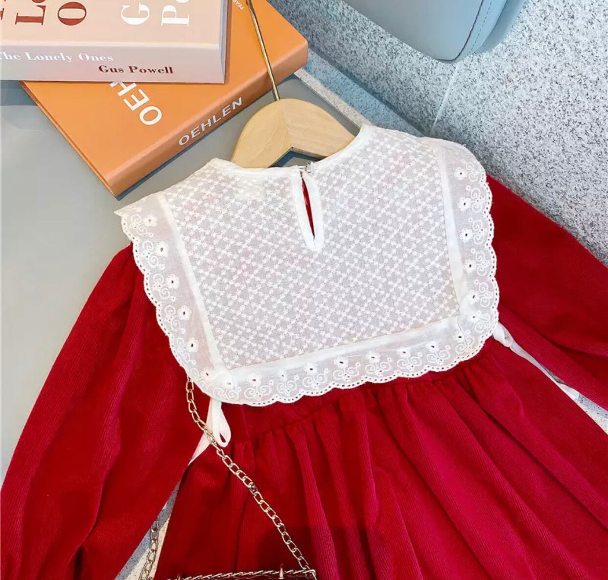 クリスマスカラー 赤のコーデュロイワンピース (つけ襟 取り外し可)